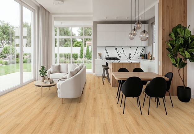 Elwood® luxury vinyl planks from the Wayne Parc Reserve™ Collection feature soft blonde hues with smooth variation and subtle knots brought to life through grain-aligned EIR embossing and an UltraMatte finish for a natural woodgrain finish. These 9” x 72” planks offer a 12mm thickness and a waterproof WPC core that delivers a warm, cushioned feel underfoot. A 30MIL CrystaLux Ultra protection layer helps resist scratches, spills, and everyday wear. This high-performance plank includes pressed natural bevels and a 100% natural cork backing to improve acoustics and mask subfloor flaws. With drop-lock installation and no acclimation needed, Elwood® delivers a clean, contemporary wood look with reliable, all-day performance.